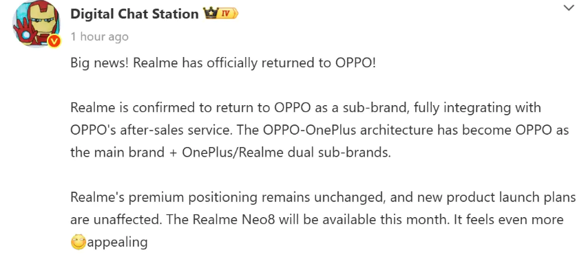 La nuova organizzazione, in ogni caso, non cambiera i piani già programmati di realme, a partire dalla presentazione del nuovo realme Neo8, prevista per la fine di questo mese di Gennaio in Cina.