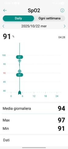 • Ossigenazione del Sangue (SpO₂): Misura la saturazione di ossigeno nel sangue, un indicatore chiave della salute respiratoria.
