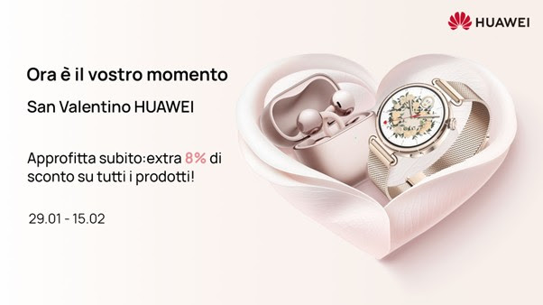L’amore e la cura non sono solo parole. Sono gesti. E poiché l’amore si manifesta nei piccoli momenti, “Ora è il vostro momento” per renderli indimenticabili con la tecnologia che mantie-ne connessi. I dispositivi intelligenti non si limitano a dare energia alla nostra vita. Essi raffor-zano la connessione, la fiducia e la presenza in un mondo che si muove velocemente, cele-brano un amore che dura oltre l’istante e avvicinano i cuori. Nei momenti di quiete, nella routi-ne quotidiana e in quei dettagli premurosi che fanno sentire una persona veramente capita e apprezzata, diventano una promessa silenziosa: nelle playlist condivise durante le passeggia-te mattutine, in uno sguardo rassicurante alle informazioni sul benessere dopo una lunga giornata, o nel comfort di rimanere connessi senza interruzioni, ricordando ogni giorno al part-ner quanto si tiene al benessere dell’altro. La Stagione di San Valentino Huawei, valida fino al 15 febbraio, è l’occasione per scegliere il dono ideale a un prezzo unico: con il cou-pon ACSSANV8 si ha infatti diritto a un extra sconto del 8%  su un’intera selezione di pro-dotti pensati per valorizzare le passioni di chiunque.