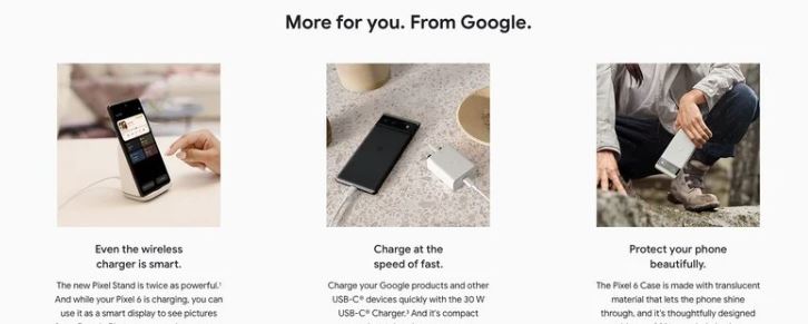 Non potevano mancare gli accessori, ai quali viene dedicata una pagina specifica. Sembra confermato che non ci saranno i caricatori nelle confezioni dei Pixel 6 e Pixel 6 Pro, per seguire le (pessime) orme di Samsung ed Apple. Per ora non ci sono notizie in merito a cover e custodie specifiche che, a quanto sembra, arriveranno solo in seguito al presentazione ufficiale che, lo ricordo, sarà il prossimo 19 Ottobre.
