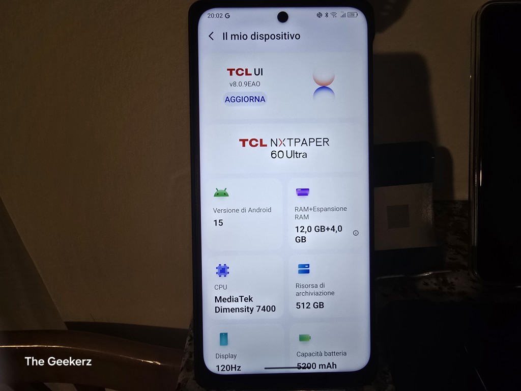 - Memoria: 12 GB di RAM LPDDR5 (con possibilità di espansione virtuale di altri 12 GB) e opzioni di archiviazione interna da 256 GB o 512 GB (non espandibile). L’accoppiata RAM-CPU assicura che il sistema, basato su Android 15 con interfaccia personalizzata TCL UI, giri sempre in modo reattivo, gestendo bene il multi-tasking e il rapido passaggio tra le diverse modalità del display.