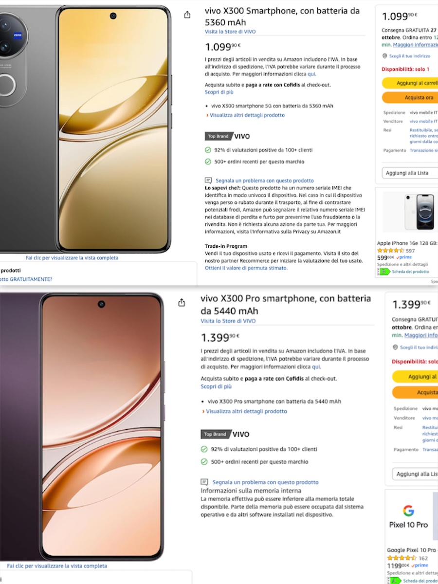 Vivo X300 su Amazon Italia, batterie castrate e prezzi ufficiali